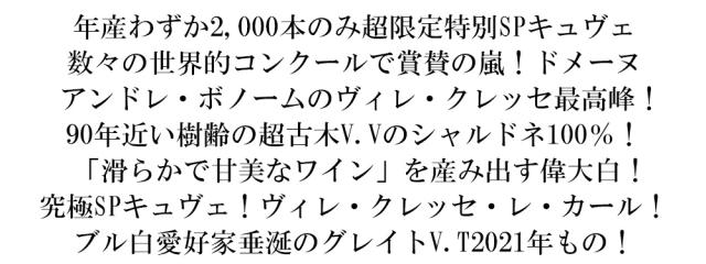 年産わずか2,000本のみ超限定特別SPキュヴェ 数々の世界的コンクールで賞賛の嵐!ドメーヌ アンドレ・ボノームのヴィレ・クレッセ最高峰! 90年近い樹齢の超古木V.Vのシャルドネ100%! 「滑らかで甘美なワイン」を産み出す偉大白! 究極SPキュヴェ!ヴィレ・クレッセ・レ・カール! ブル白愛好家垂涎のグレイトV.T2021年もの!