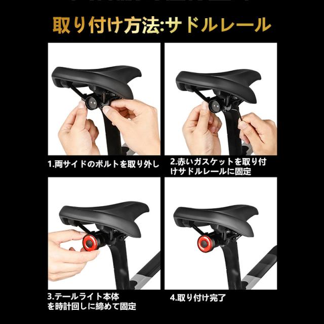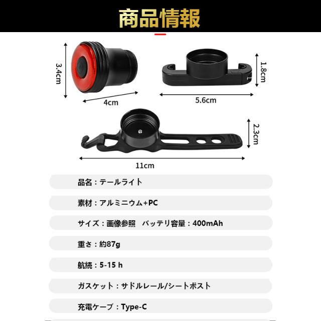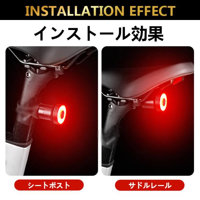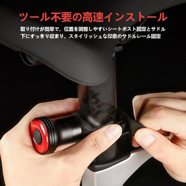 自転車テールライト 自動 点灯 消灯 明るさ調整 ブレーキ警告 シートポスト LED 赤 USB充電 サドルレール用 IPX5防水 400mAh