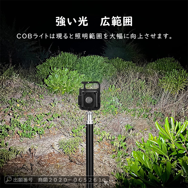 | 【使用方法】 | ◆4つ点灯モード変換が可能 ・1回押し:COB低輝光 ・2回押し:COB中輝光 ・3回押し:COB強輝光 ・4回押し:点滅SOSモード |