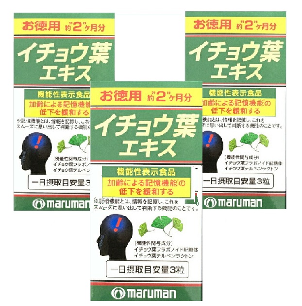 商品説明『 マルマン イチョウ葉エキス 200粒 』は、フラボノイドやテルペンラクトンが高含有のイチョウ葉エキスに、DHAやレシチンなどをブレンドした栄養機能食品です。特にお年寄りや働き盛りの中高年の方の健康の維持にお役立てください。届出番号:B426【マルマン イチョウ葉エキス 200粒 詳細】栄養成分表示 【 3粒 当たり 】エネルギー9.0kcalたんぱく質0.31g脂質0.79g炭水化物0.16gナトリウム0.0023gビタミンE81mgイチョウ葉フラボノイド配糖体28.8mgイチョウ葉テルペンラクトン7.2mgDHA含有精製魚油(DHA27%含有)225mg大豆レシチン(ホスファチジルコリン35%含有90mg原材料など名称マルマン イチョウ葉エキス 200粒原材料サフラワー油、DHA含有精製魚油、イチョウ葉エキス末/ゼラチン、ビタミンE、大豆レシチン、グリセリン、グリセリン脂肪酸エステル、ミツロウ内容量440mg(1粒内容量 330mg)×200粒保存方法直射日光や湿気の多いところを避け、涼しいところに保存して下さい。販売者マルマンバイオ 株式会社お召し上がり方通常、健康補助食品として1日3粒程度をそのまま水またはぬるま湯といっしょに召し上がりください。区分日本製・機能性表示食品商品仕様シリーズ名 イチョウ葉エキスブランド名 マルマンメーカー型番 B426原産国/製造国 日本効能 加齢による記憶機能の低下を緩和する用法用量 健康補助食品として1日3粒程度をそのまま水またはぬるま湯といっしょに召し上がりください。内容量 200錠×3個セット