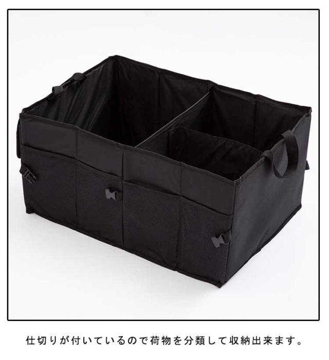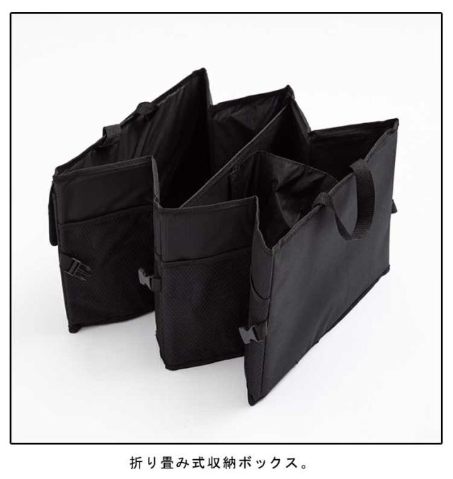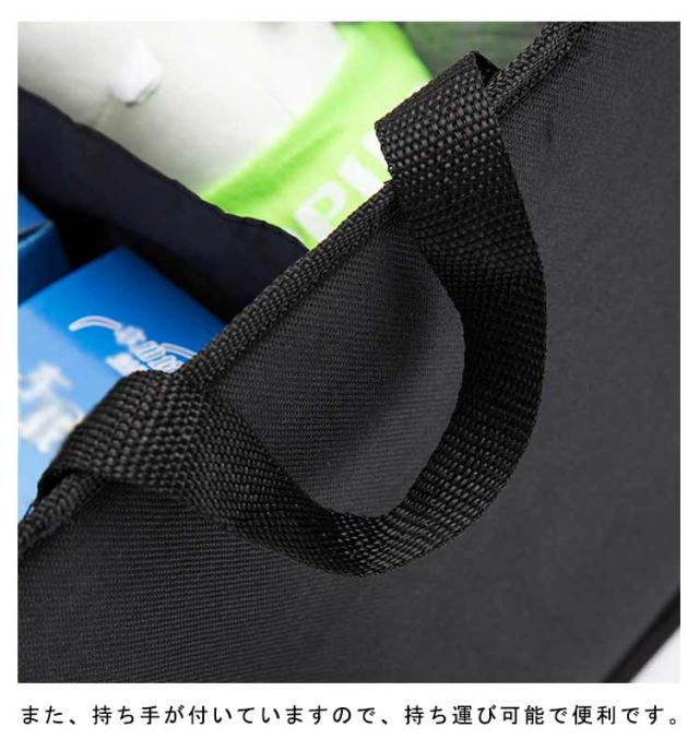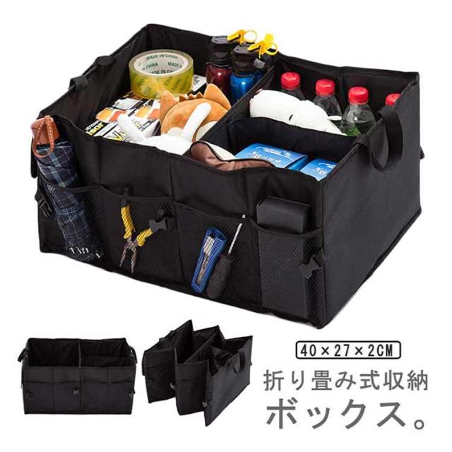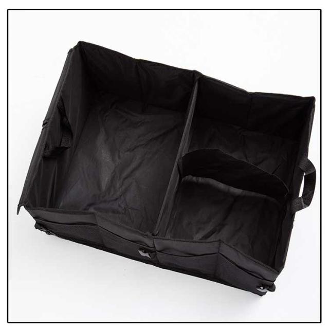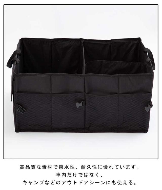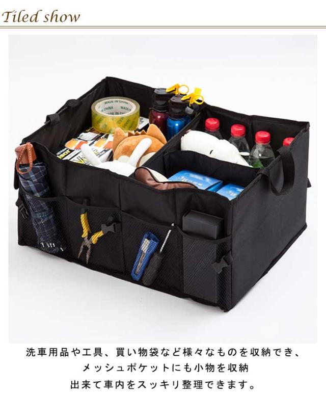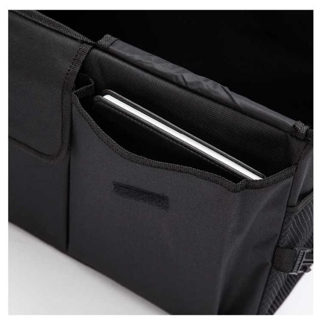| 折り畳み式収納ボックス。 洗車用品や工具、買い物袋など様々なものを収納でき、メッシュポケットにも小物を収納出来て車内をスッキリ整理できます。 仕切りが付いているので荷物を分類して収納出来ます。 また、持ち手が付いていますので、持ち運び可能で便利です。 高品質な素材で撥水性、耐久性に優れています。 車内だけではなく、キャンプなどのアウトドアシーンにも使える。 | |