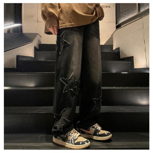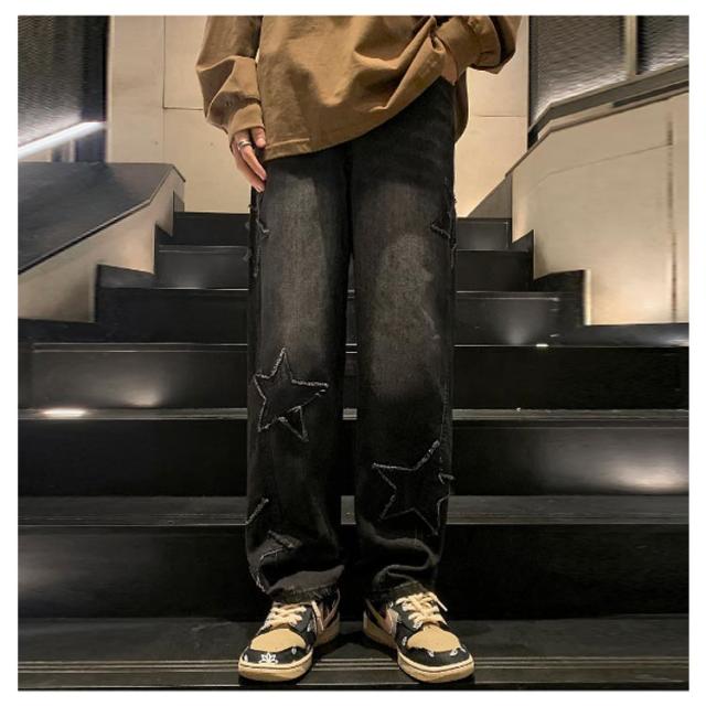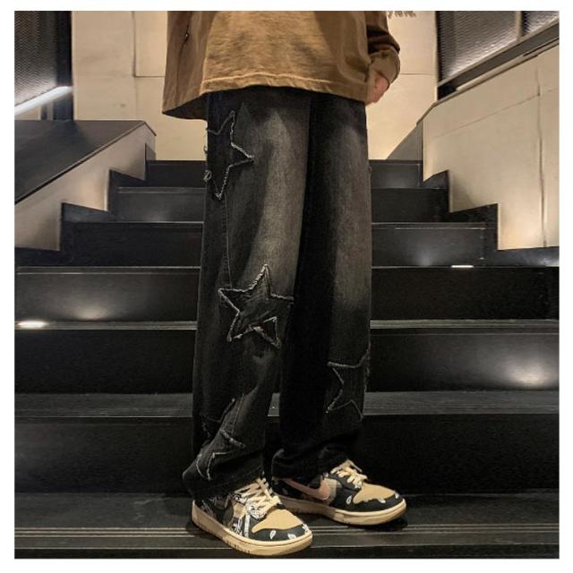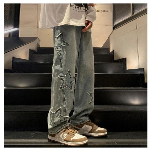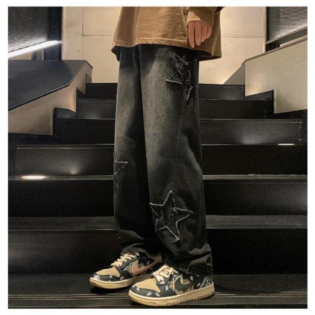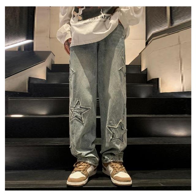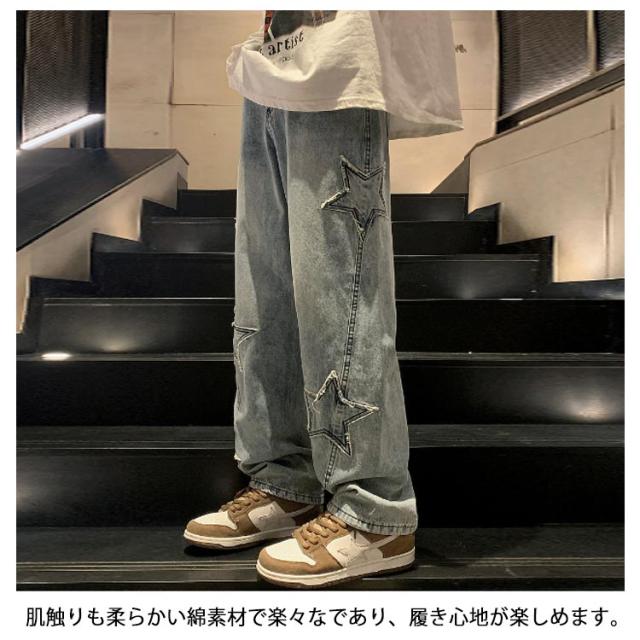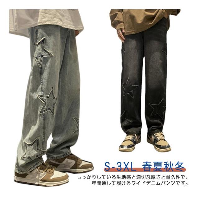 ワイド 男子 ジーンズ デニムパンツ メンズ 男性用 パンツ ボトムス ロングパンツ 長ズボン 春夏秋冬 レトロ 星型 ストリート カジュアル ゆったり 大きいサイズ ズボン ヒップホップ 20代 30代