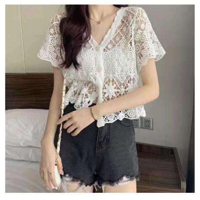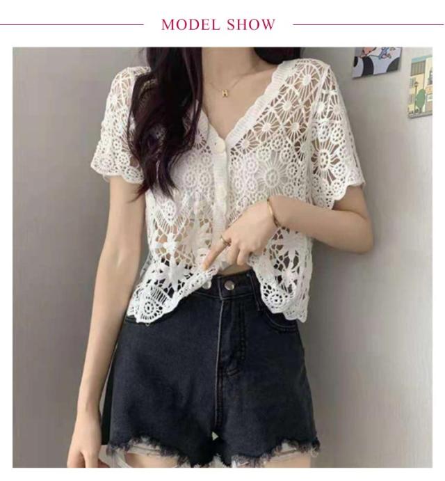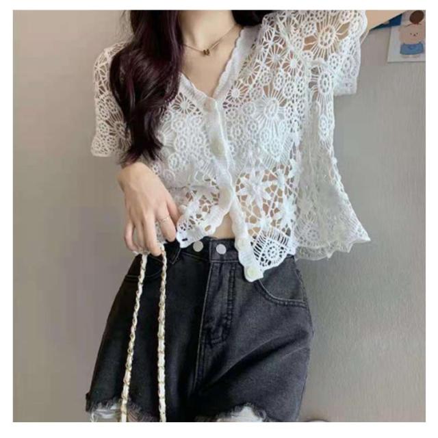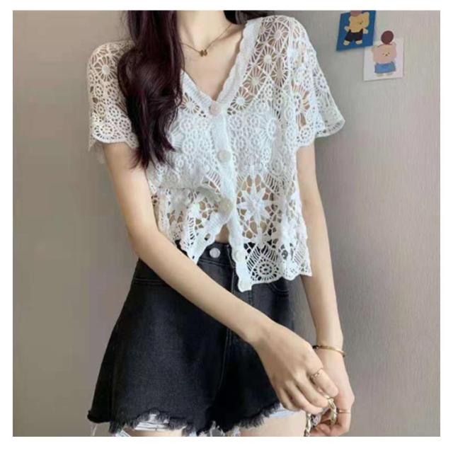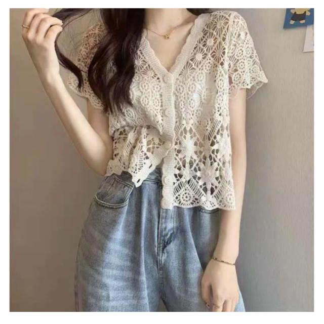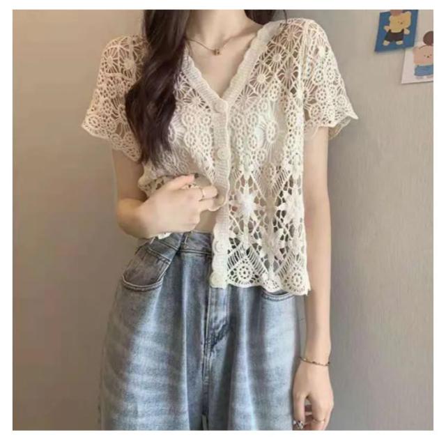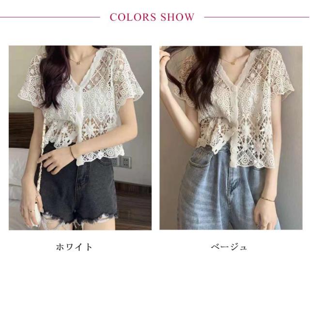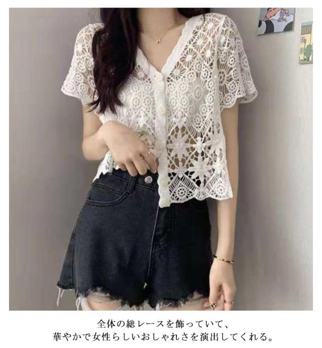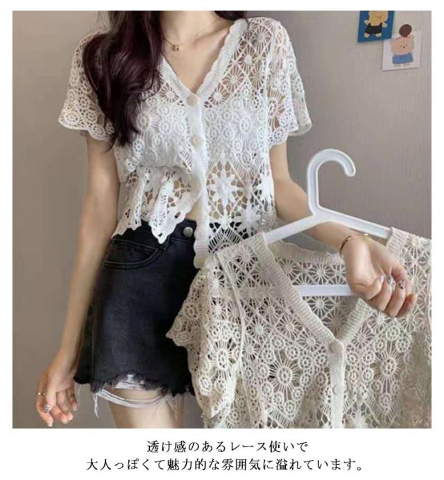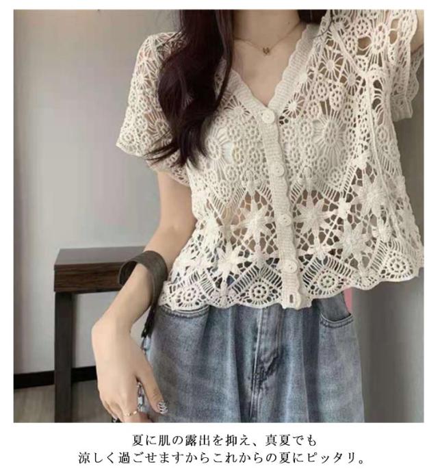 Vネック 羽織り カーディガン レースTシャツ 透かし サマーニット 透かし編み トップス 花柄レース ボレロ レディース 刺繍 カットソー ブラウス 半袖カーディガン 春夏 おしゃれ サマーニット 通勤 デート