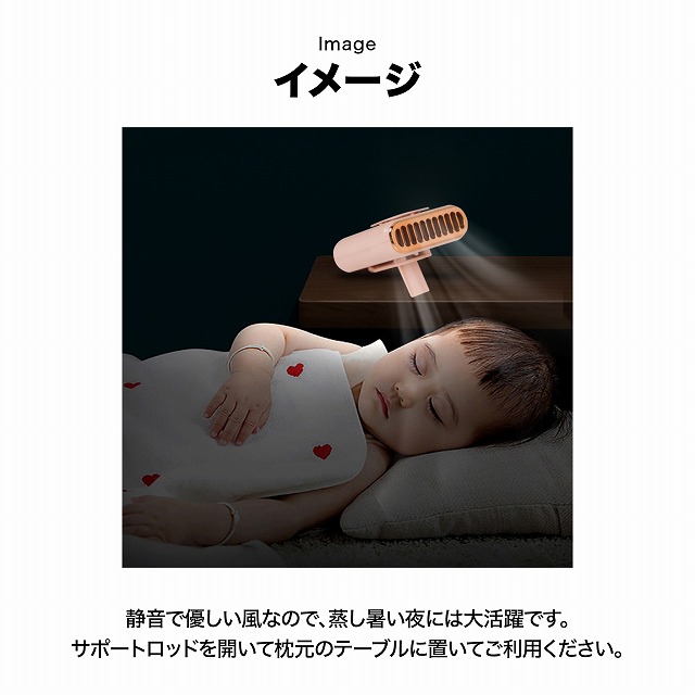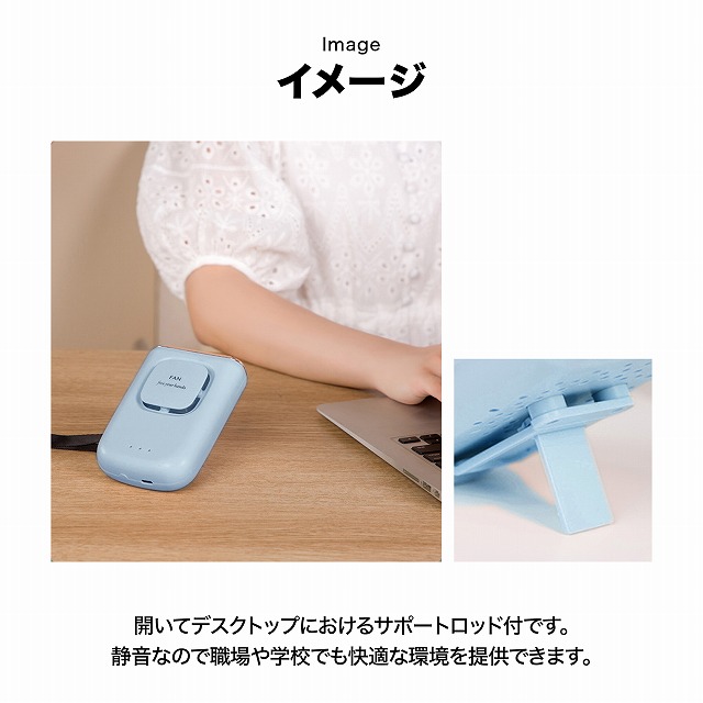 折りたたみスタンドで卓上ファンとしても使えます。コンパクトなサイズ感でお手軽です。USB充電可能な2000mAhの大容量バッテリー内蔵。USB TypeC対応。モバイルバッテリーがあれば場所を選ばずいつでも充電可能です。