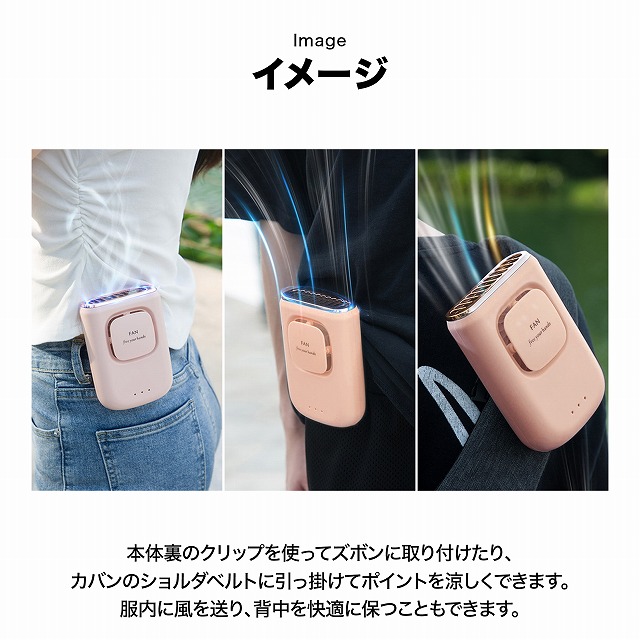 本体裏のクリップで腰回りに付けて使えます。両手フリーで服内や背中に風を送れて快適です。