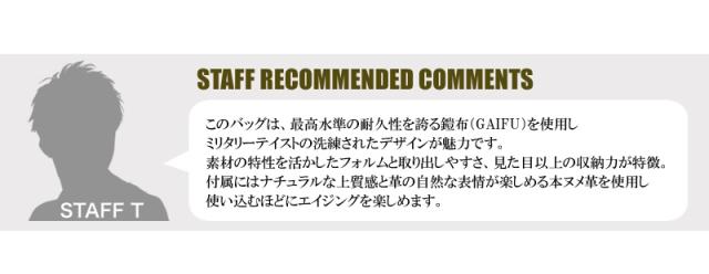 | 素材 | 表:鎧布(GAIFU)(超高強力66ナイロン) 裏:ナイロンオックス 付属:本ヌメ革(100%植物タンニンなめし) |