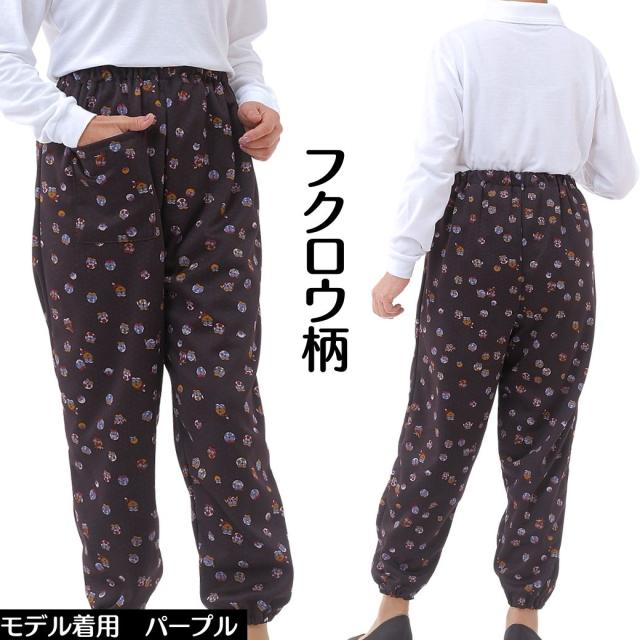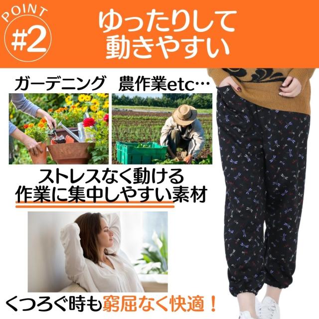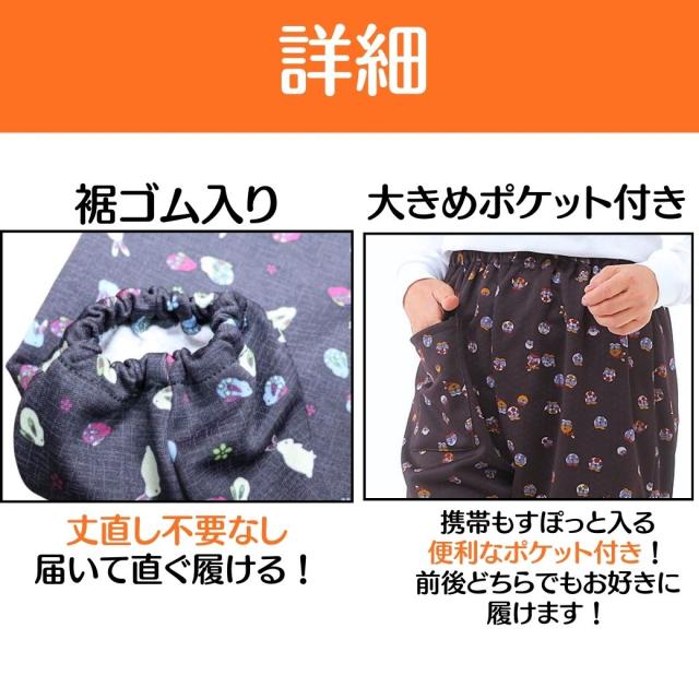 【サイズ】 M/L/LL 【素材】ポリエステル100% 【生産国】日本 【商品説明】かわいい柄のソフトで動きやすい裏起毛もんぺ日本製。股上をしっかり取っているのでお腹や背中が出ることなくガーデニングや農作業など、作業性の良い商品です。濃い柄物のため、汚れが目立たず洗っても代わり映えする事がありません。 前右側に大き目のポケットが付いています。また、ウエストは総ゴムです。柄はかわいい「ふくろう」「とんぼ」「うさぎ」の柄になっています。 ポリエステル100%の四段スムースニットで伸縮性があり、ソフトで動きやすい素材です。裾ゴムはゆったりさせました。色柄豊富な9種類からお選びください。 ■【注意事項】 ※平置きでの採寸です。商品の個体差により、多少の誤差が出る場合もございます。あらかじめご了承ください。 ※できるだけ忠実に再現するよう努力しておりますが、ディスプレイ画面等の環境上、ページで見た色と実際の商品の色とは多少違う場合がございます。ご不明な点はお問い合わせください。