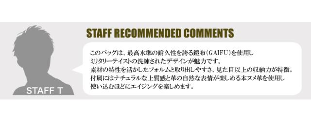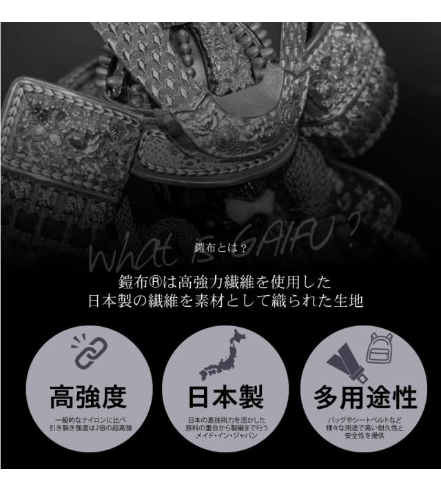 | 素材 | 表:鎧布(GAIFU)(超高強力66ナイロン) 裏:ナイロンオックス 付属:本ヌメ革(100%植物タンニンなめし) |