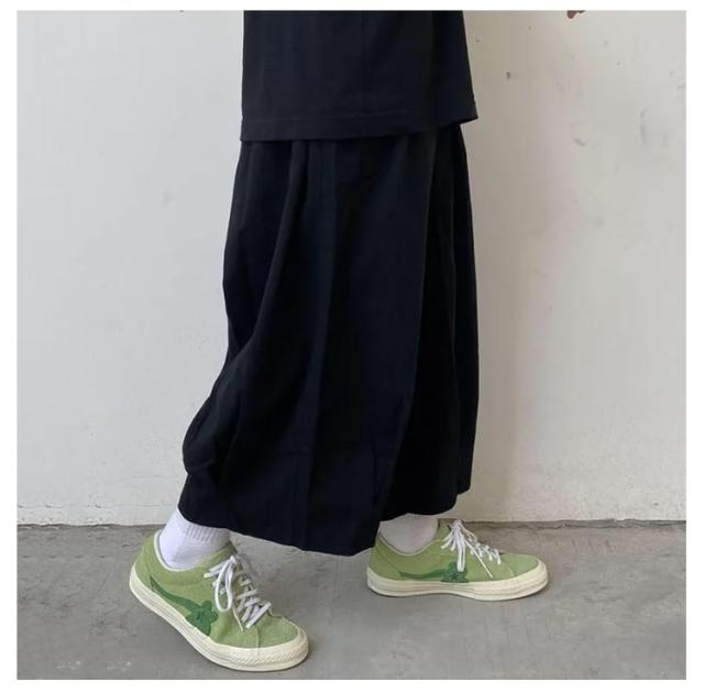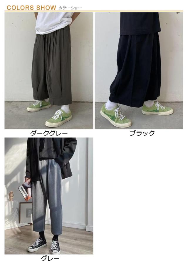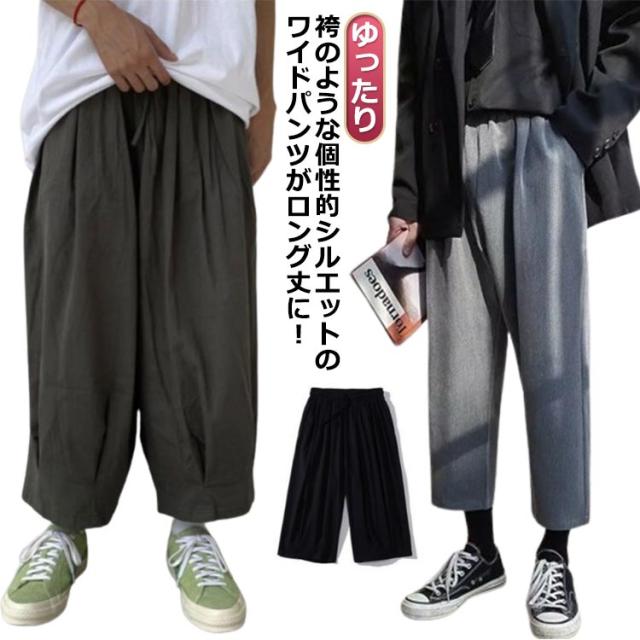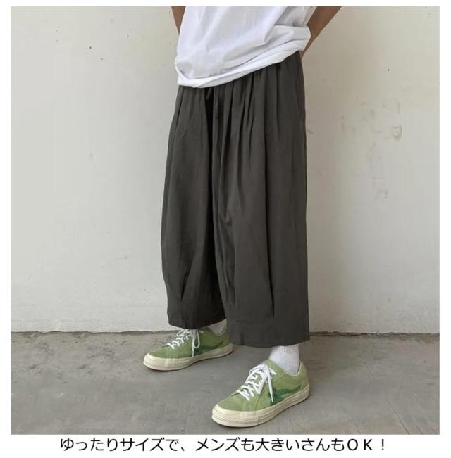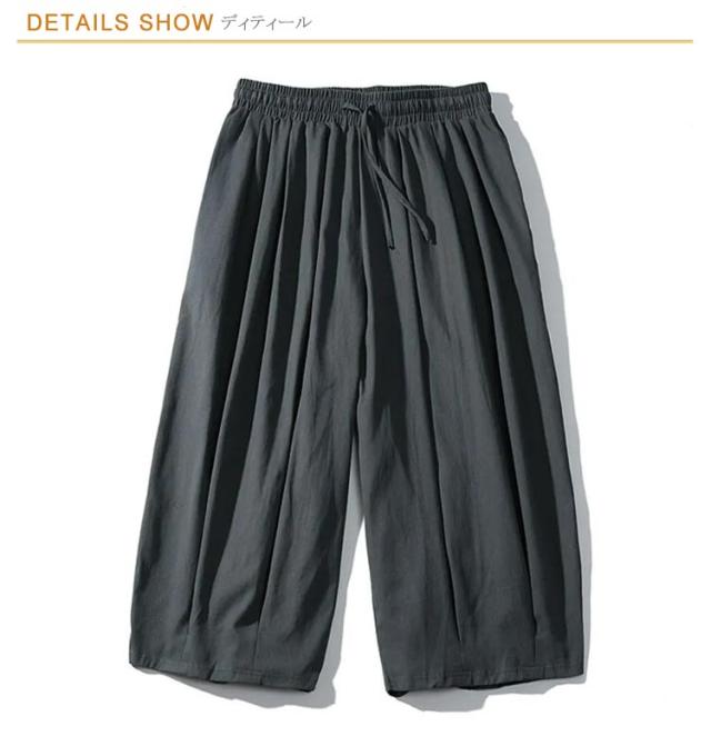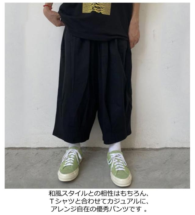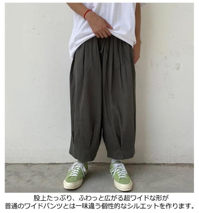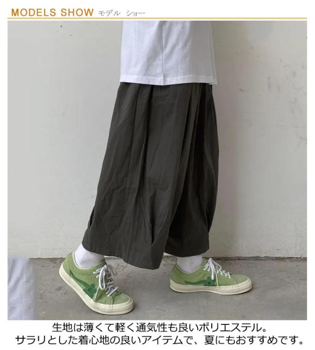 | 袴のような個性的シルエットのワイドパンツがロング丈に! 生地は薄くて軽く通気性も良いポリエステル。サラリとした着心地の良いアイテムで、夏にもおすすめです ゆったりサイズで、メンズも大きいさんもOK! 股上たっぷり、ふわっと広がる超ワイドな形が普通のワイドパンツとは一味違う個性的なシルエットを作ります。 和風スタイルとの相性はもちろん、Tシャツと合わせてカジュアルに、アレンジ自在の優秀パンツです | |