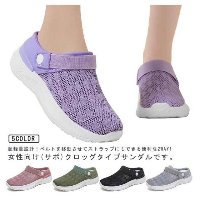 | 超軽量設計!ベルトを移動させてストラップにもできる便利な2Way!女性向け(サボ)クロッグタイプサンダルです。 アッパー部分はメッシュ素材で通気性バツグン! かかと部分に高さがあるので安定して歩きやすい! 中敷きは取り外しできるので靴の中を清潔に保つことができ、靴底は全方向に曲がって動きやすい! 色んなシーンで活躍してくれるアイテムです。 | |