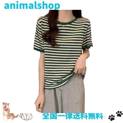[Wowcarbazole] tシャツ レディース 半袖 ボーダー 夏tシャツ クルーネック 綿 カジュアル 快適 可愛い カットソー ストライプ (B02.グ