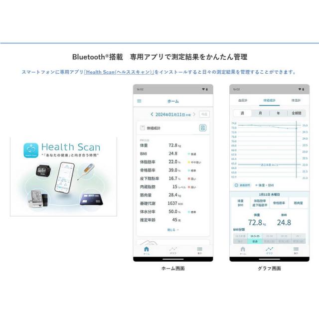 体重計 体組成計 Bluetooth スマホ連動 ヘルススキャン デジタル 薄型 スリム BMI 体脂肪 内臓脂肪 筋肉量 基礎代謝量