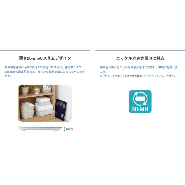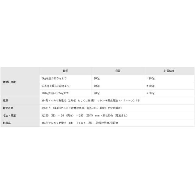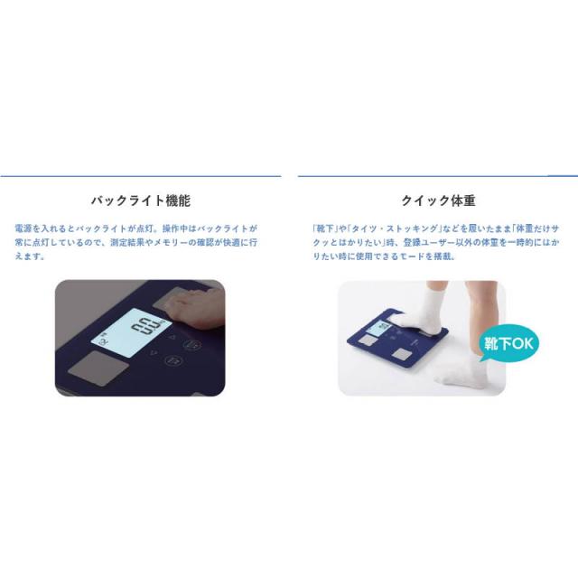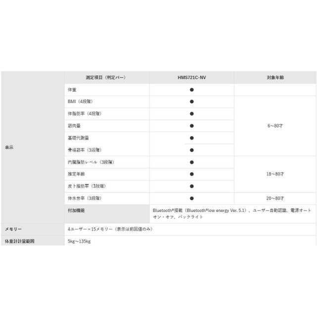 測定項目:体重・BMI(4段階)・体脂肪率(4段階)・筋肉量・基礎代謝量・骨格筋率(3段階)・内臓脂肪レベル(3段階)・推定年齢・皮下脂肪率(3段階)・体水分率(3段階)