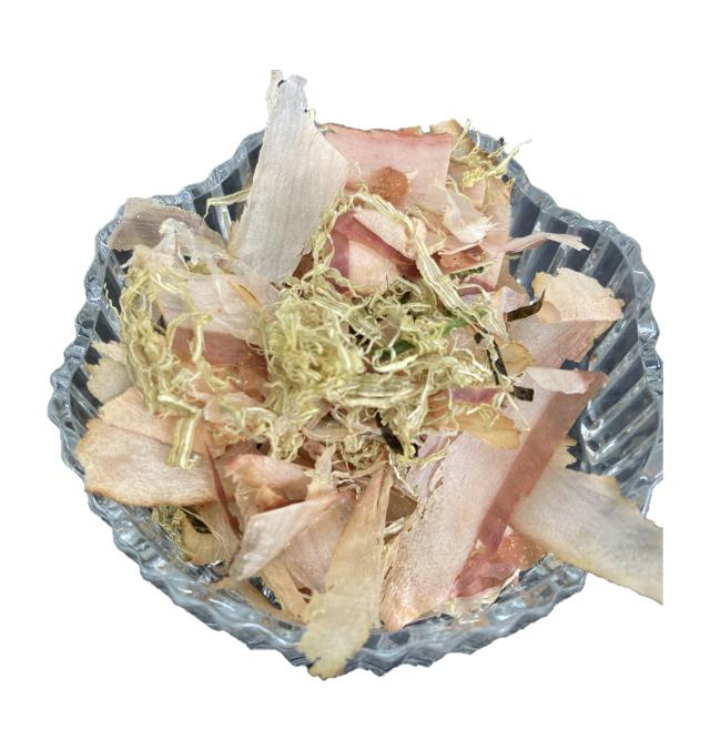 原材料名 かつおの節(かつお(国産))、昆布加工品(昆布(国産)、醸造調味料、砂糖、醤油、食塩)、片口いわし(国産)、ヒトエグサ(国産)/調味料(アミノ酸等)、酸味料(一部に小麦・大豆を含む)