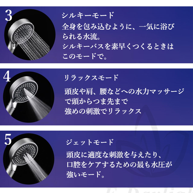 " リラクスモード ":勢いと充分なバブル数を兼ね備えた、最も水圧を感じるモード、" ミストモード ":バブル最多の霧状ミストモード、"ミックスシャワーモード ":水量も泡数も兼ね備えたモードの3つから目的に合わせてカスタマイズできます。