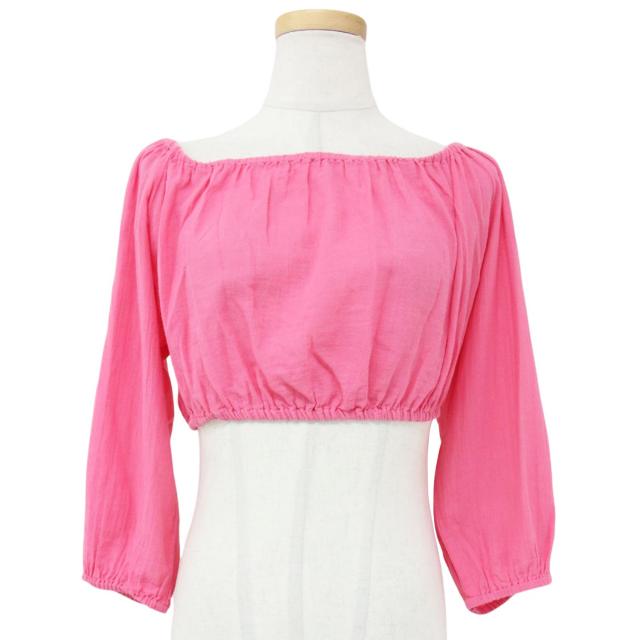 agnes b. アニエスベー ブラウス コットン ピンク 1(S) 2WAY ギャザー スクエアネック オフショルダー クロップド丈 長袖 トップス カットソー 無地 シンプル カジュアル【レディース】【中古】【K4132】