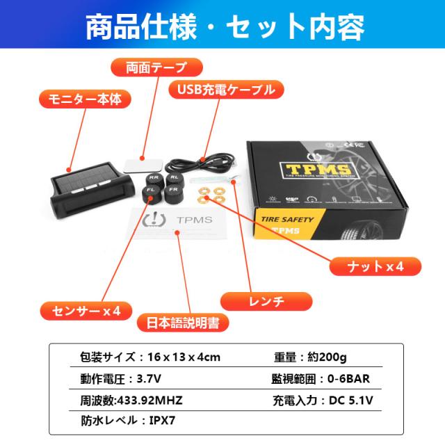 タイヤ 空気圧モニター 空気圧センサー 車 タイヤ交換 ゲージ 空気圧計 チェッカー 空気圧計 USB充電 温度 監視 ワイヤレス ソーラー充電 無線