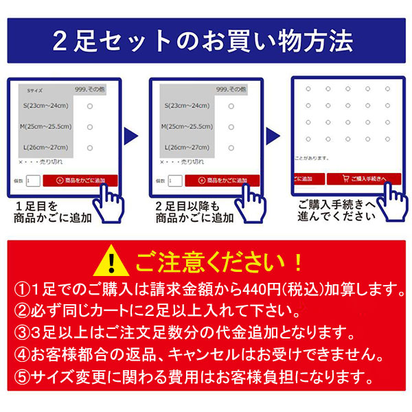 コチラの商品は2足セット販売です。必ず同じカート(1回のご注文)で2足以上お選びください。1足のみのご注文は請求金額から440円(税込み)加算致します。2足以上であれば何足でもOKです!