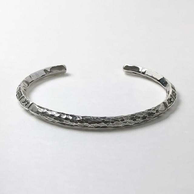 ランダムな槌目の凹凸が光を受けて表情を変え、シルバーの質感をより力強く引き立てます。