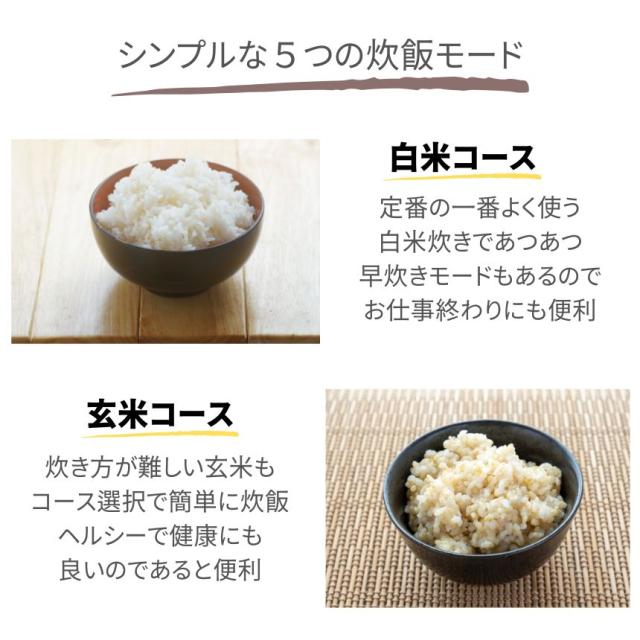 シンプルな5つの炊飯コースを搭載!それぞれのモードに合わせて専用の計量カップが付属しているので失敗もありません!