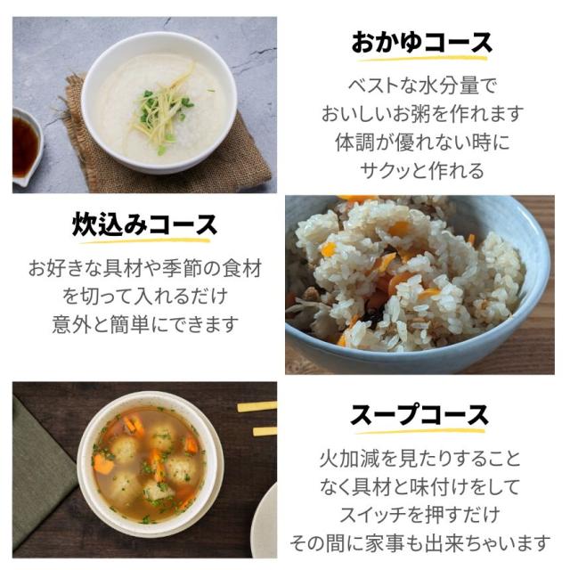 炊飯コース:白米、炊き込み、玄米、おかゆ、スープ