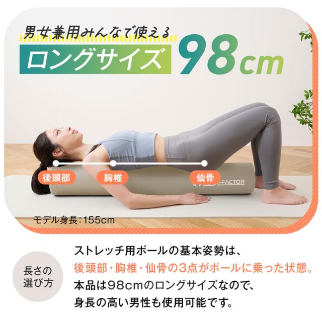 ■ハルクファクターのストレッチ用ポール(エクササイズポール)は98cmのロングサイズ。男女問わず、無理なく上半身を載せることができます。