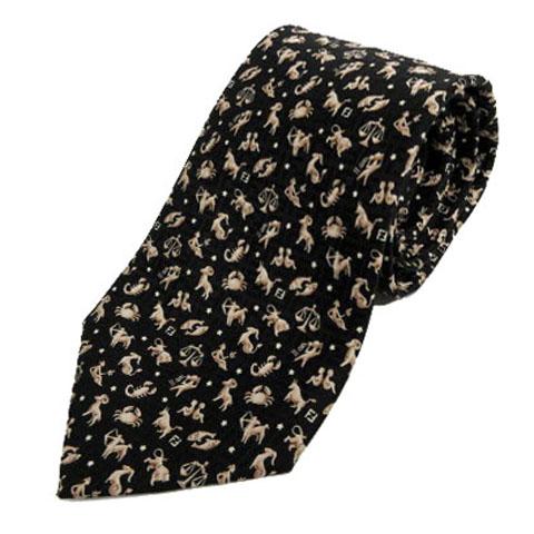 【中古】フェンディ FENDI ネクタイ ナロータイ イタリア製 シルク100% ズッカ柄 星座柄 ブラック 黒 茶系