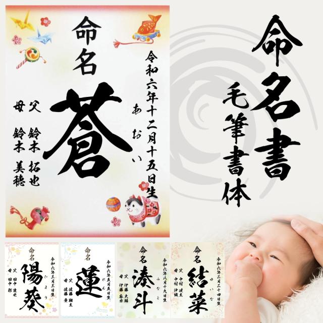命名書 縁起物柄 (2枚セット) 毛筆 名入れ 命名紙 手書き風 代筆 A4サイズ ラミネート オーダー お祝い 男の子 女の子 記念 出産 ベビー 赤ちゃん 新生児 名付け祝い お七夜 孫 人気 プレゼント 出産祝い