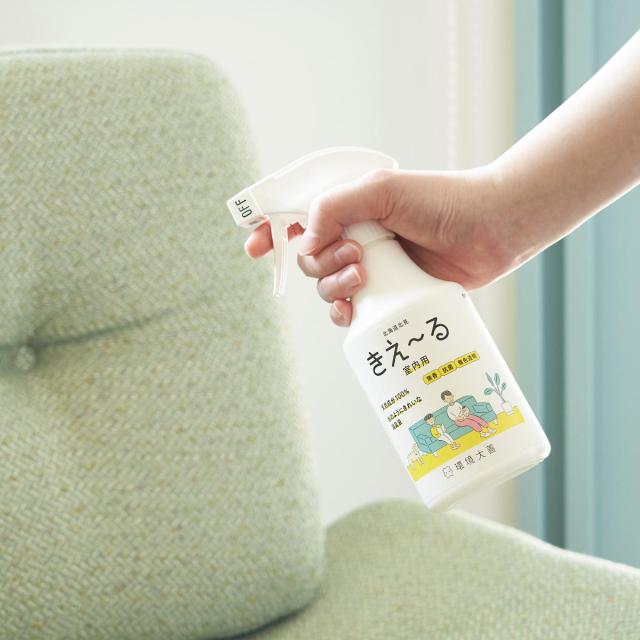 「きえ〜る」は環境微生物群(乳酸菌等)を発酵・培養した「善玉活性水」から生まれたバイオ消臭液スプレーです。いい香りをそのままに嫌なニオイだけ消臭します。なかなか洗えないソファーやラグに直接一吹きするだけで、善玉活性水の力でニオイを元から分解・消臭します。