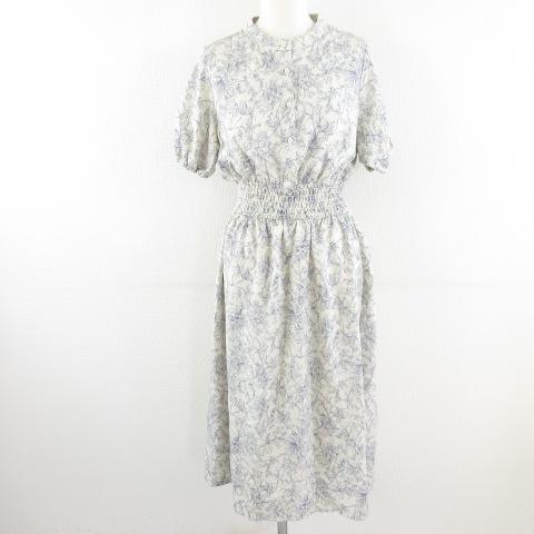 【中古】チップクリップ CHiPCLiP フレアワンピース 半袖 ひざ丈 花柄 ストレッチ グレージュ 紺 L *A523 レディース