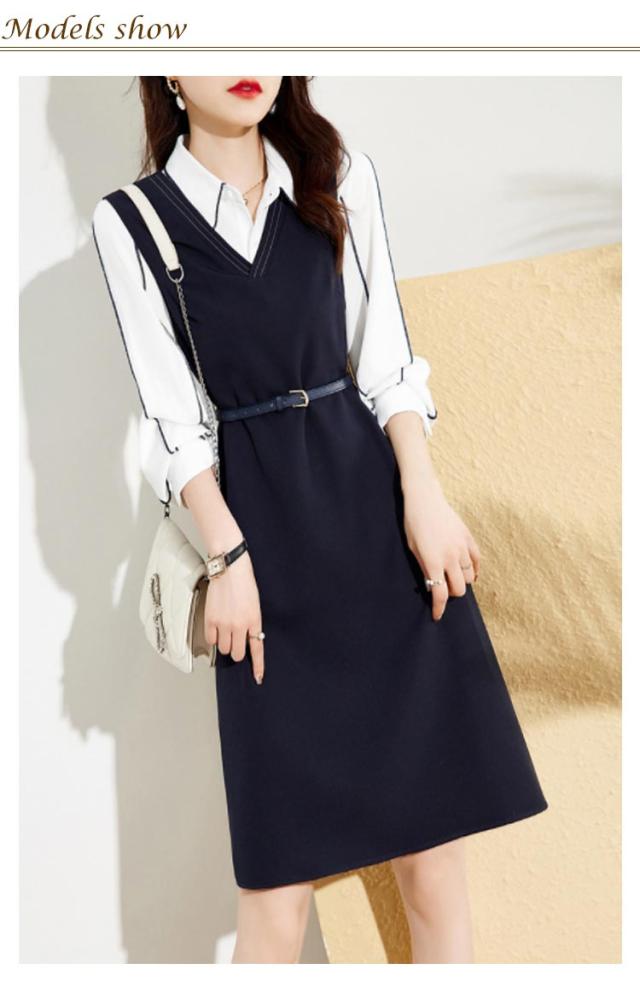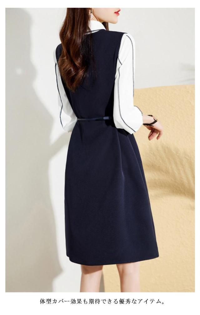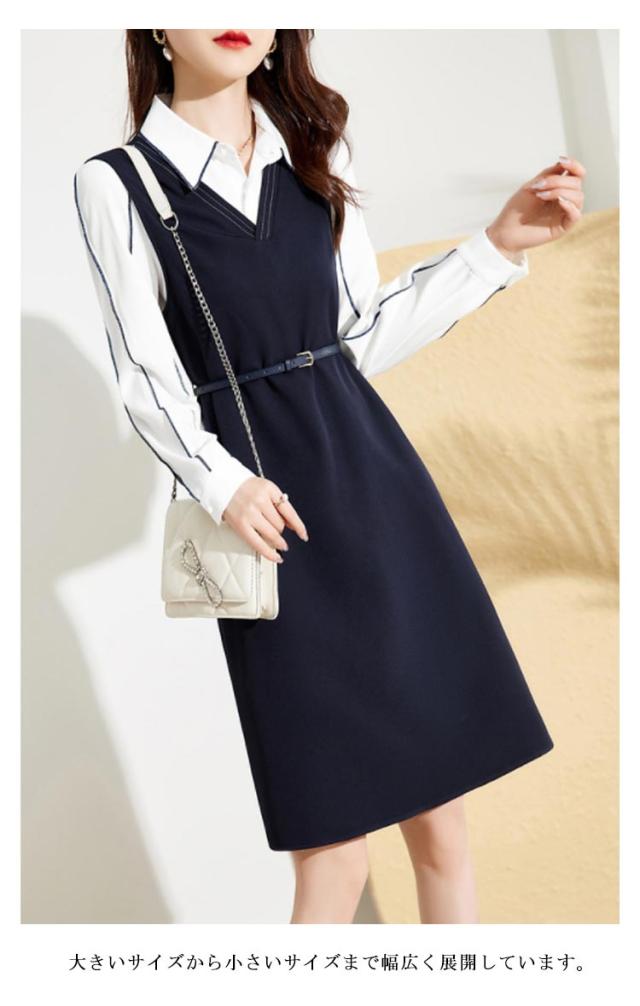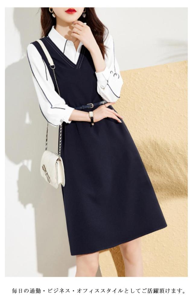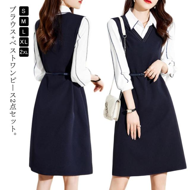 ブラウス+ベストワンピース 2点セット レディース 長袖 トップス ワンピース ストライプ ベルト付き フォーマル 膝丈 セレモニー 膝上丈ワンピース チュニック 春 夏 秋 入学式 事務服 20代 30代 40代