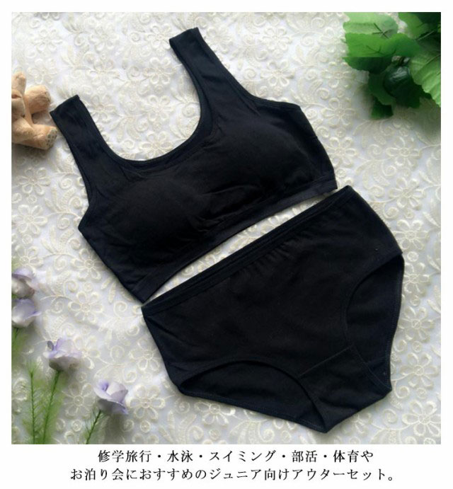 | 2セット(4点) 学生高学年〜中学生向け女の子用下着セット。 綿(コットン)素材で気持ちいい肌触り。 修学旅行・水泳・スイミング・部活・体育やお泊り会におすすめのジュニア向けアウターセット。 伸縮性のあるノンストレスな着心地。 体にピッタリフィットして揺れないのでダンス衣装のインナーとしても大活躍! | |