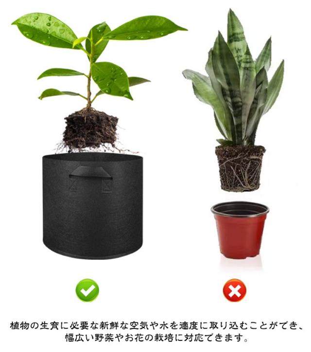 | 全5サイズ!不織布プランター 5枚入 ・通気性・保水性抜群 植物の生育に必要な新鮮な空気や水を適度に取り込むことができ、幅広い野菜やお花の栽培に対応できます。 ・軽くて丈夫!! 土を入れても軽量で、取っ手を掴めば持ち運びもできます。 縫製もキレイなので耐久性も抜群です! ・コンパクト!! 使わない時は簡単に折りたたんで収納でき、繰り返し使用できます。 | |