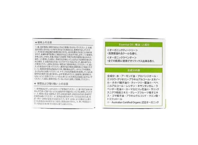 【全成分】水(天然水)・アーモンド油・プロパンジオール(植物由来)・ミツロウ(ビーズワックス)・グリセリン(植物由来)・アラキルアルコール(植物由来)・エタノール(植物由来)・ホホバ油※・ティートリー油※・ベヘニルアルコール(植物由来)・レシチン(植物由来)・キサンタンガム・ラベンダー油※・ローマカミツレ油(ローマン・カモミール)※・サリックスニグラ樹皮エキス(植物由来)・グレープフルーツ種子エキス・ゴマ油(セサミシードオイル)・アラキルグルコシド(植物由来)・クエン酸(植物由来)・トコフェロール(ナチュラルビタミンEオイル)