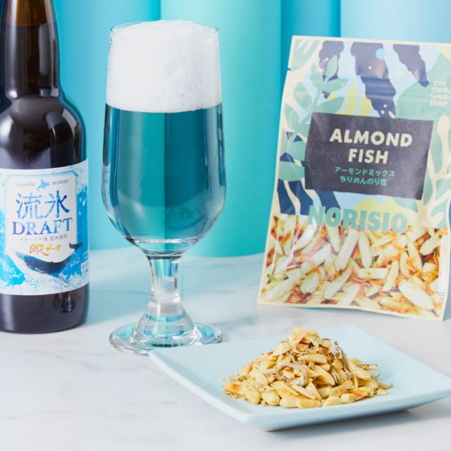 あおさのりの磯の香り、アーモンドとちりめんのかりっと食感が楽しい、素材を生かした味わいのスナックと、網走の冬の風物詩「流氷」を仕込水に使用し、鮮やかなブルーが特徴的な青いビールのおつまみセット。