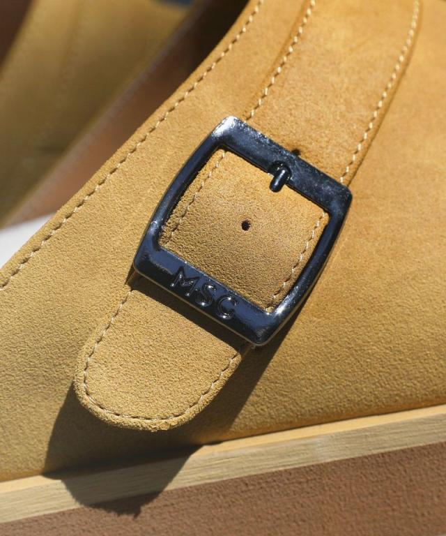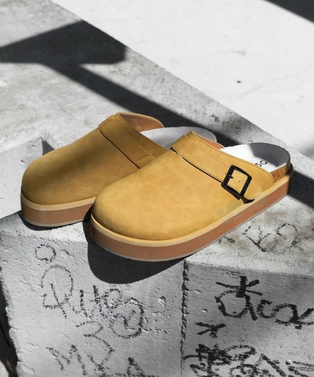 さっと脱ぎ履きしやすいラクな穿き心地と抜け感が魅力のスリッポンです。サボのように足のつま先から甲を覆ったデザインで、露出したかかと部分がリラックス感を感じさせます。甲部のシルエットに丸みがあり、コルク風の靴底を使用しているのが特徴的。かかとは足の収まりがいいカップ状で、指先まで足の形状にフィットしやすよう形取られています。アッパーのベルトを調節してフィット感を微調整することが可能で、バックルに入ったブランドロゴもさり気ないアクセントに。