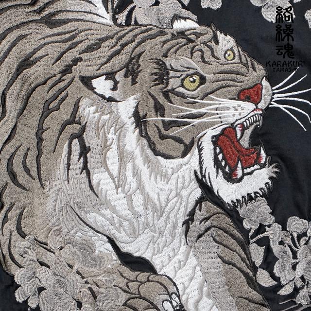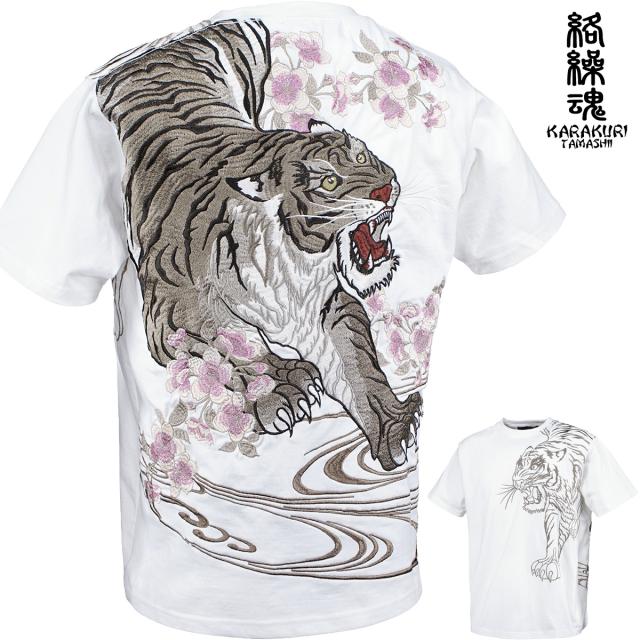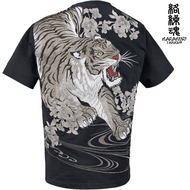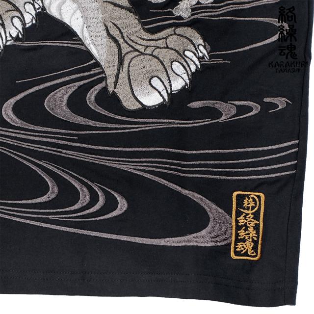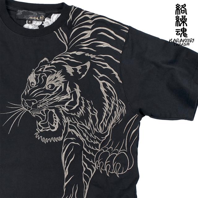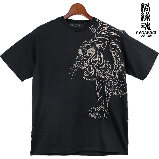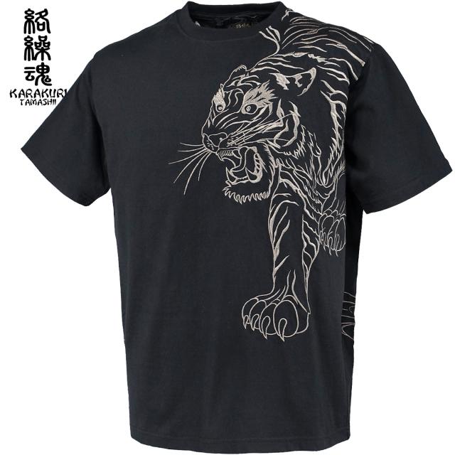 からくり魂 絡繰魂 Tシャツ 半袖 クルーネック粋 信長の虎 和柄 刺繍 メンズ(ブラック黒) 242063