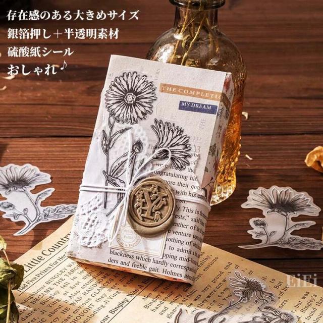 銀箔押し 半透明シール 海外シール 花 フラワー フレークシール コラージュ 素材 デコレーション シック 大きめ トレーシングペーパー トレペ 素材 硫酸紙 シール 海外ステッカー ブラック ローズ 薔薇 手帳デコ 色塗り ジャーナル シロクロ 手帳 日記 アルバム DIY