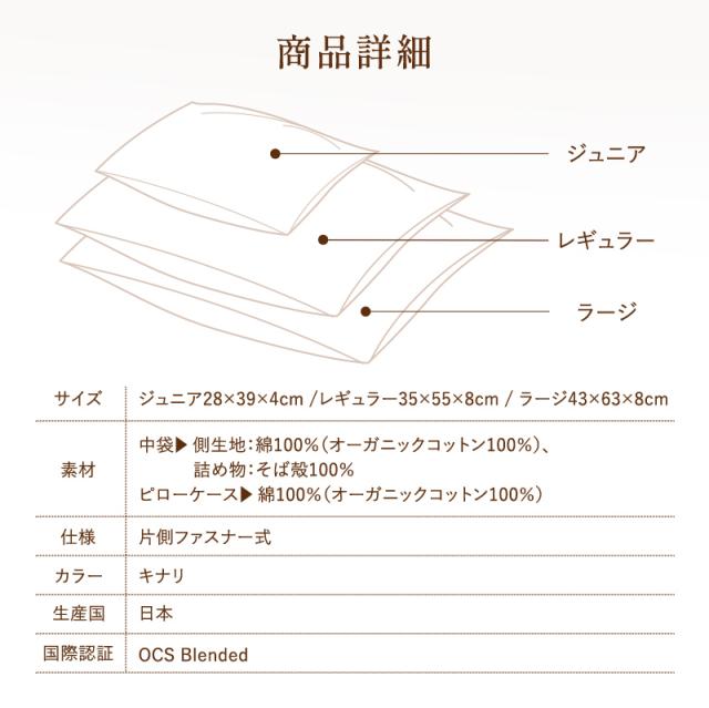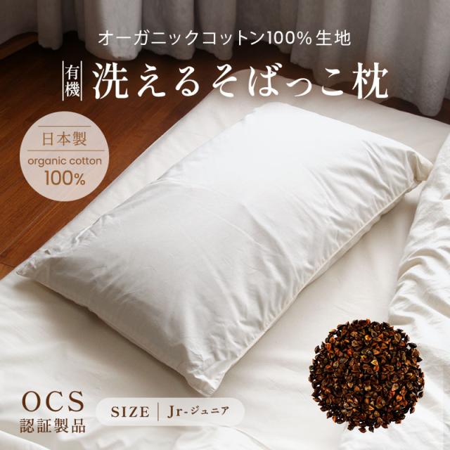 【日本製】有機洗えるそばっこ枕 ジュニア(28×39cm)そば殻まくら ソバ殻 オーガニックコットン100%生地 高さ調節3段階 手洗い可