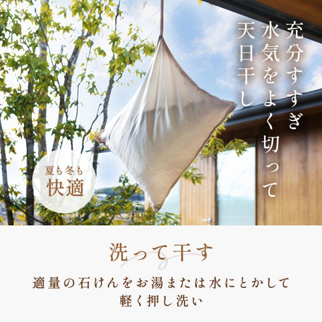中袋(そば殻): 中袋は開封できません。そのまま手洗いしてください。 石けん適量をお湯、または水に溶かし、軽く押し洗いしてください。 洗い終わったら十分すすいでください。 脱水のみ洗濯機をご使用いただけます。(ネット使用、一分以内を推奨) そば殻は、洗う度に色が出ます。側生地に色素が移ることがありますのでご注意ください。 カバー: 洗濯機を使用される場合、洗濯ネットの使用、水位の設定などは取扱説明書に従ってください。 必ずファスナーを閉めて洗濯してください。 閉めずに洗濯するとファスナーが破損する恐れがあります。 素材の特性上、長時間日光や蛍光灯にあたると変色することがあります。 |