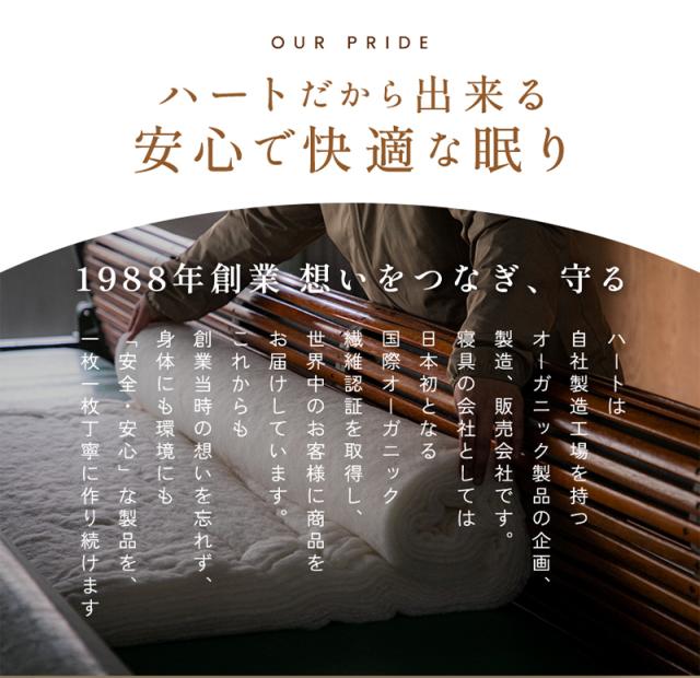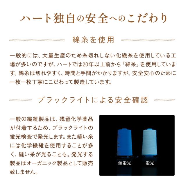 ・生地やわたについている「黒い点」について 薬品処理をしていない無漂白のコットン原料には、黒や茶色の粒が見られます。 これは綿花の収穫時にコットンのガクや茎・葉が残ったもの。一般的には、漂白などの化学処理によって取り除かれますが人体には無害で、なにより薬品不使用の安心の証です。 ・防縮加工について オーガニック製品のため一般的な防縮加工はしておりません。 そのため、お洗濯などによる縮みを考慮し、表示サイズより大きめに製造をしております。 数回のお洗濯で安定してきます。 ・生地の色について 無漂白、無染色の天然素材の生地は、薬品未処理のため製造時期によって色味に若干濃淡の差があります。 ・輪染みについて 長時間濡れたまま置くと、植物の色素がにじみ出てシミをつくる恐れがあります。 洗濯後はすぐに干してください。 |