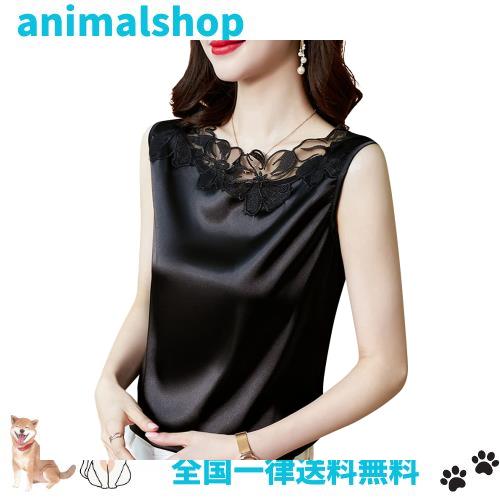 [Phorecys] タンクトップ レディース サテン 光沢感 ノースリーブ ブラウス インナー キャミソール ストレッチ レース おしゃれ ブラック