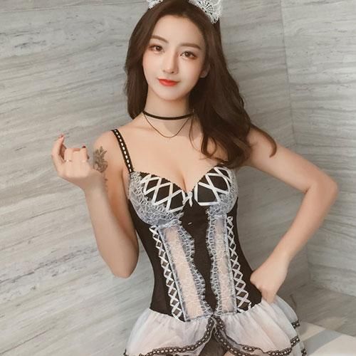 繊細な柄のレース切り替えとレースアップ装飾がバレリーナ衣装のように華やかで可愛らしいコルセット風ガーターランジェリー(GARTER LINGERIE)。