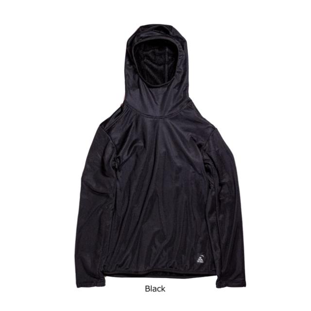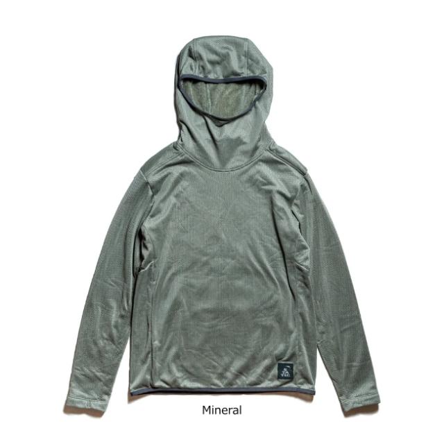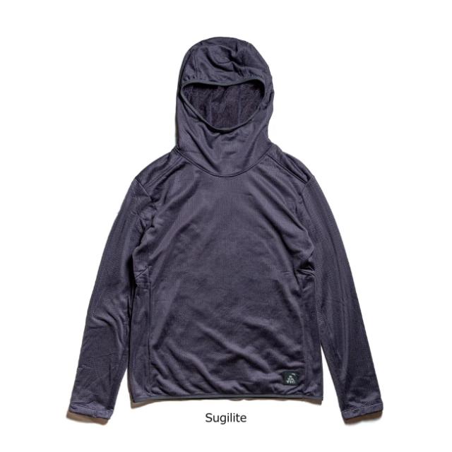 特殊なメッシュ構造のため、一般的に薄手と言われる300g前後のフリースと比べ圧倒的に軽く、重量比の保温性が非常に高いフーディ。