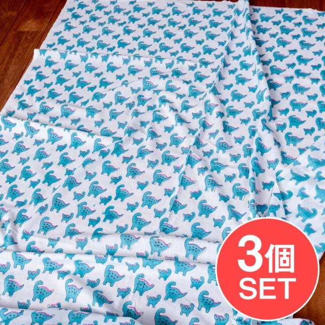 【3個セット】〔1m単位切り売り〕ジャイプル 職人手作り インド伝統の木版染め更紗マルチクロス〔幅約114cm〕 - インドの恐竜家族さんです。セットでお得になっています♪