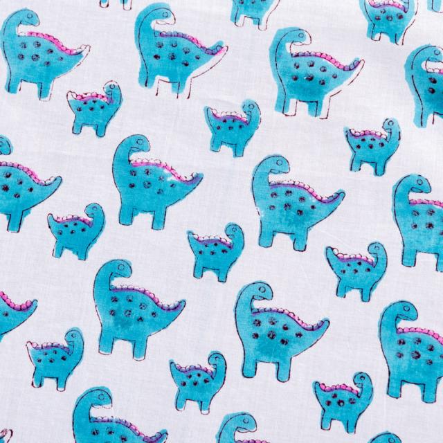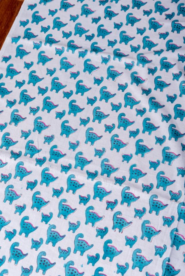 とってもかわいい生地がジャイプルからやってきました。インドらしい木版とインド綿100%のファブリックです。たまにゆるいデザインが発見されるインドですが、恐竜親子がデザインされた生地を見つけてきました。木版染めで作られているので、微妙なプリントのズレやかすれが、スクリーンプリントには出せない、特別な風合いに仕上がっています。