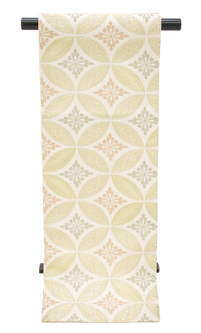 金糸で輝く美しい文様の花七宝が織り込まれた華やかなデザインです。