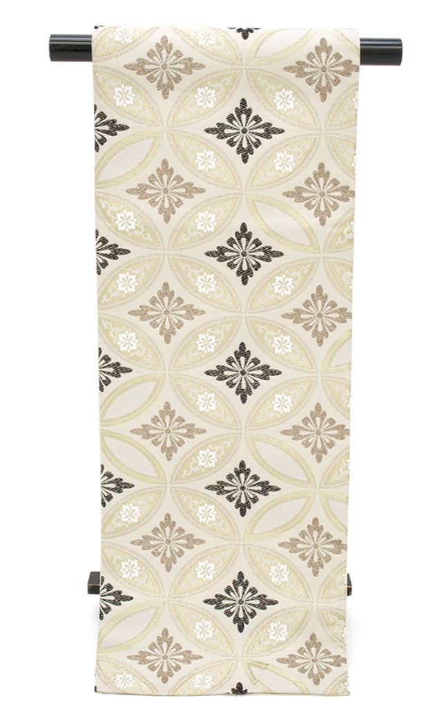 金糸で輝く美しい文様の花七宝が織り込まれた華やかなデザインです。
