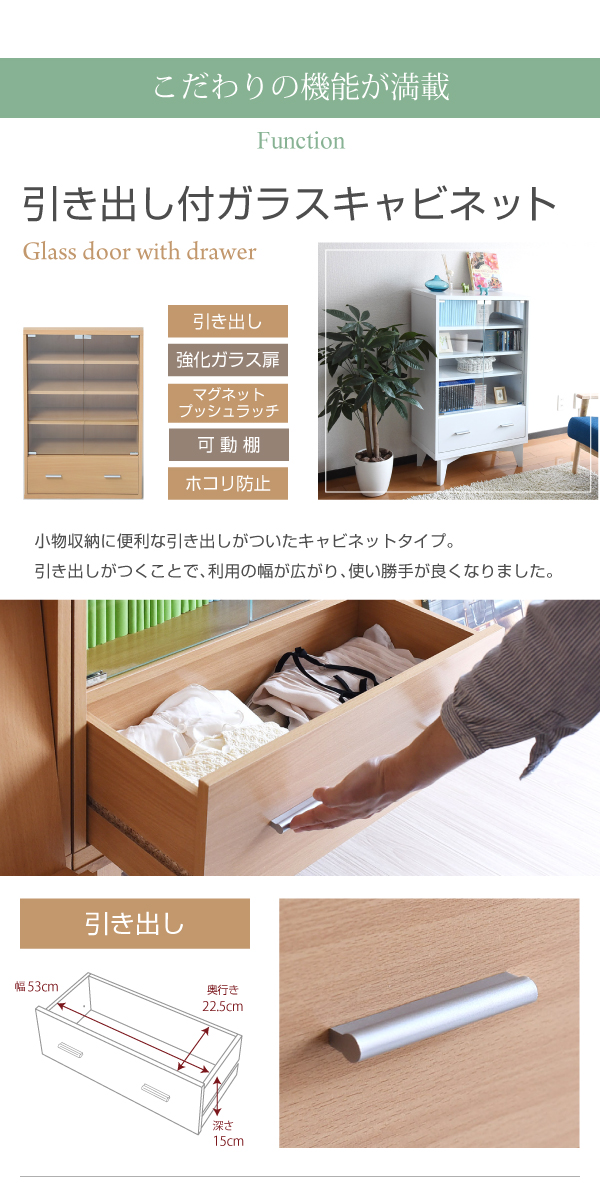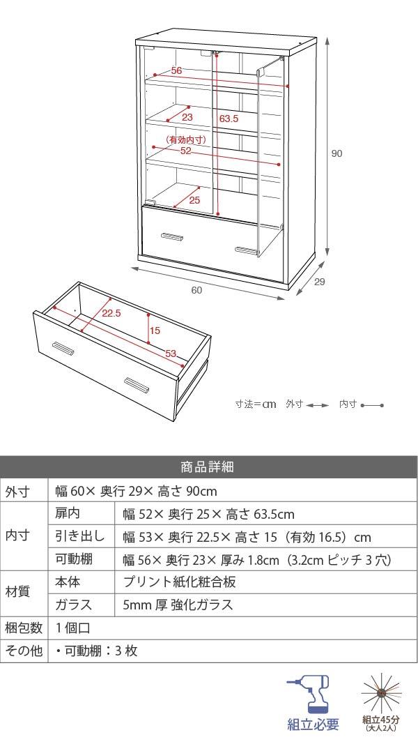 ガラスキャビネット ディスプレイラック 本棚 食器棚 キッチンラック ストッカー 幅60 コンパクト スリム ロータイプ おしゃれ 扉付 縦長 薄型 木製 ガラス 引き出し 可動棚 サイドボード リビング収納 6BOXシリーズ 2色対応
