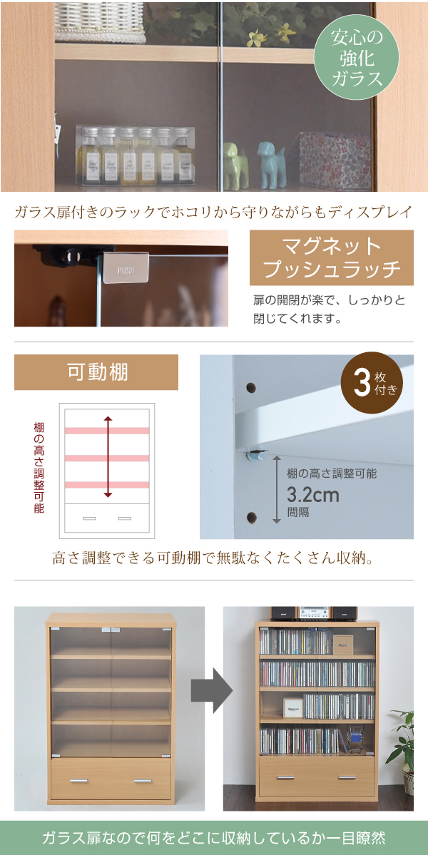 ガラスキャビネット ディスプレイラック 本棚 食器棚 キッチンラック ストッカー 幅60 コンパクト スリム ロータイプ おしゃれ 扉付 縦長 薄型 木製 ガラス 引き出し 可動棚 サイドボード リビング収納 6BOXシリーズ 2色対応